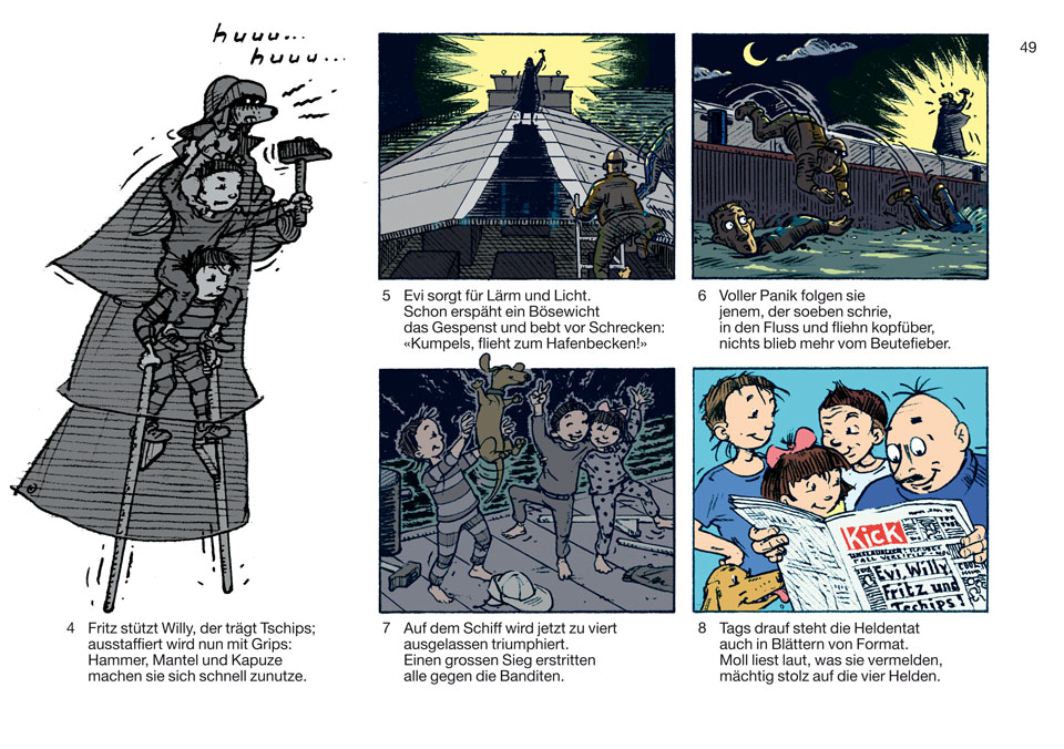 Das vorgegebene Thema für den geplanten Band liess mein Herz höher schlagen, denn mit Flüssen, Seen, Meeren und was sich darauf und darin bewegt, hatte ich ja reiche Erfahrung. Also schrieb und zeichnete ich 30 Geschichten zu den Themen Rheinschifffahrt und Familien-Dynamik – in der Absicht, damit nicht nur Kinder, sondern auch Erwachsene zu erfreuen. Ein Teil der hier gezeigten Episoden stammen aus der 2013 erschienenen chinesischen Ausgabe. Video